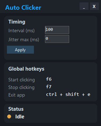 AutoClicker is a tool that automatically left-clicks any user given position on the screen, for any user-set amount of time.